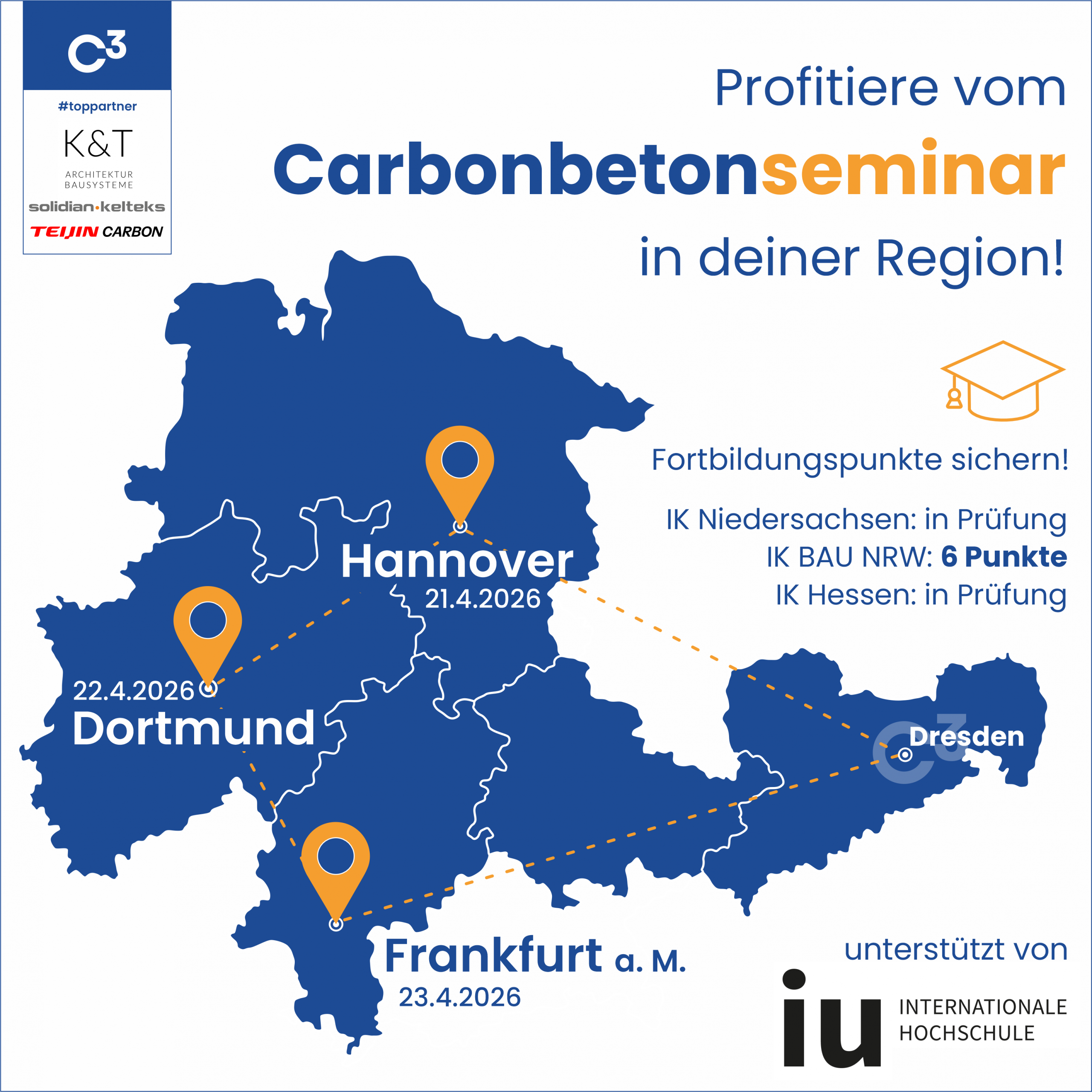 Um bei der Anwendung von Carbonbeton den Einsatz von Gefahrenstoffen zu vermeiden, hat der C³‑Verband frühzeitig eine RAL-Registrierung initiiert. Die RAL‑RG 351 stellt sicher, dass im Bauwesen für den Einsatz von matten- und stabförmigen Bewehrungen im Betonbau ausschließlich Kohlenstofffasertypen eingesetzt werden, die aufgrund ihres Bruchverhaltens oder ihrer Fasermorphologie im Lebenszyklus zu keiner gesundheitlich relevanten Freisetzung von Faserstäuben führen können. Somit haben Hersteller und Produzenten von Bauteilen und Bauwerken aus Carbonbeton die Möglichkeit, den Kunden aber auch ihren Partnern aus der Liefer- und Wertschöpfungskette mit einem Nachweis Sicherheit zu vermitteln …